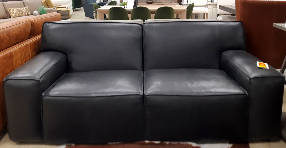 The Monique Leather Sofa features flange stitching, wide armrests, and a clean, boxy silhouette for a modern look.