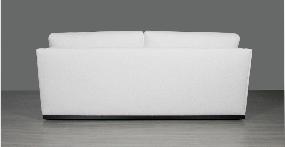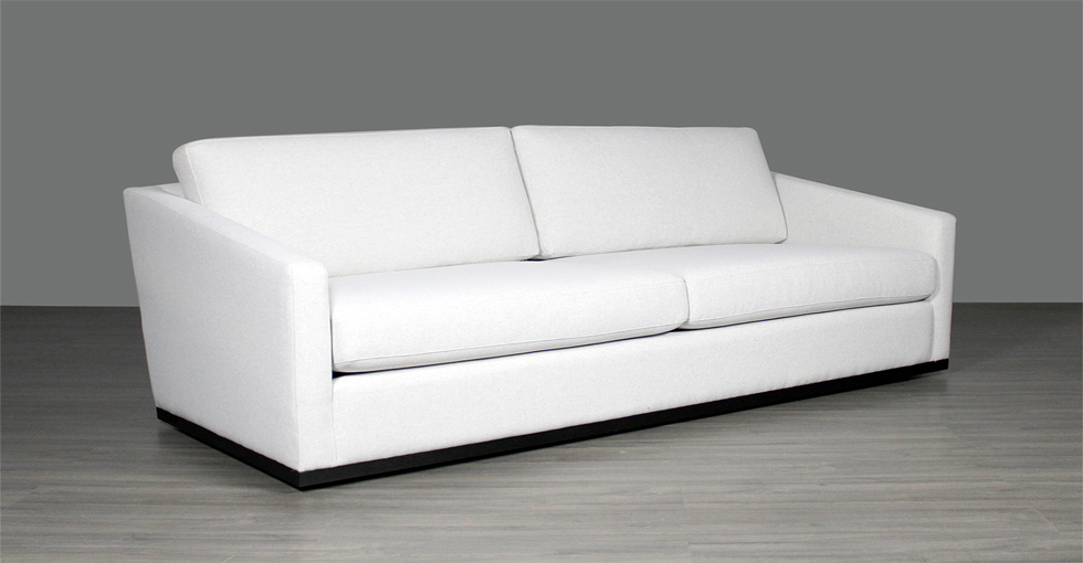 The Sabrina Sofa is a Contemporary upholstered sofa with angled arms, clean lines, and a low-profile black wood base for a sleek, modern aesthetic.